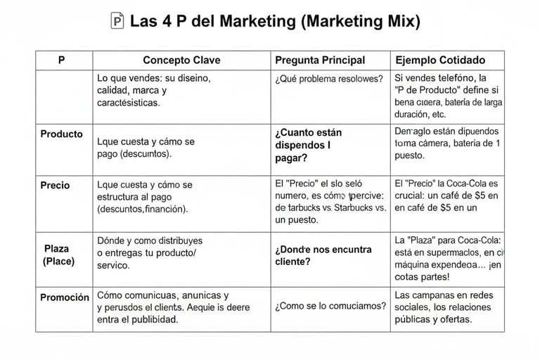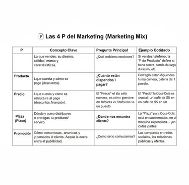 Lección 2: Los 4 Pilares del Marketing: Introducción a las 4 P's (Producto, Precio, Plaza/Distribución, Promoción). Explica cada uno con ejemplos cotidianos.