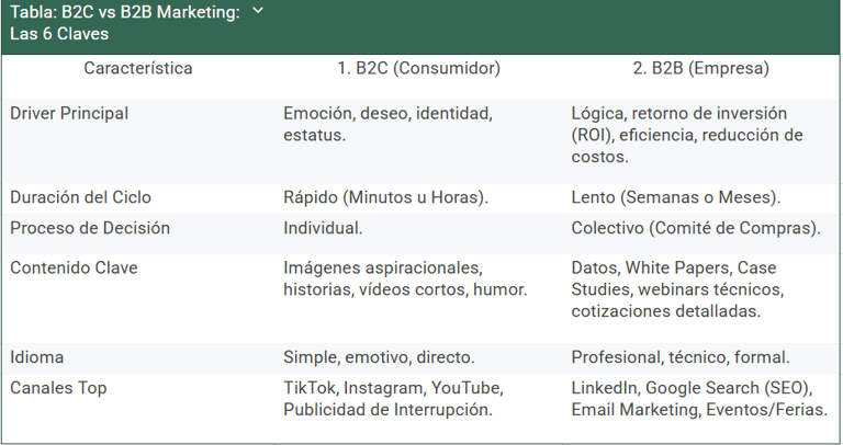 El marketing no es una talla única. La estrategia, el mensaje, los canales y hasta el lenguaje que usas cambian radicalmente dependiendo de si tu cliente final es una persona o una corporación. La clave no está en el producto, sino en el proceso de decisión y la motivación de compra.